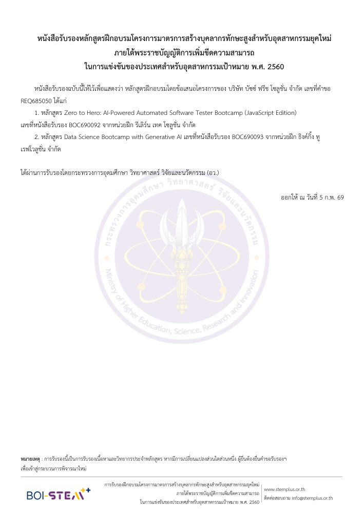 ค่าใช้จ่าย: ฟรี 100% (BOI สนับสนุน)