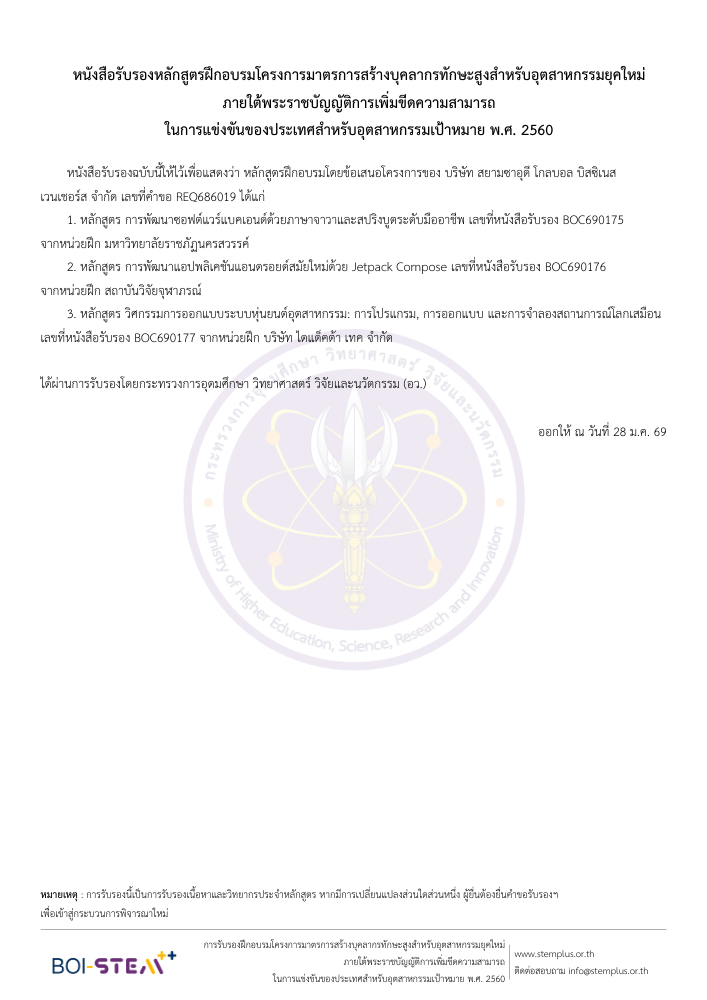 ค่าใช้จ่าย: ฟรี 100% (BOI สนับสนุน)